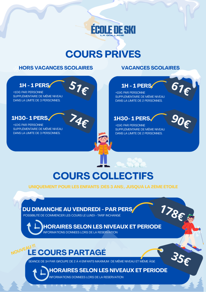 IMPORTANT : le prix des cours n’inclut pas le prix du forfait de remontées mécaniques et la location du matériel.